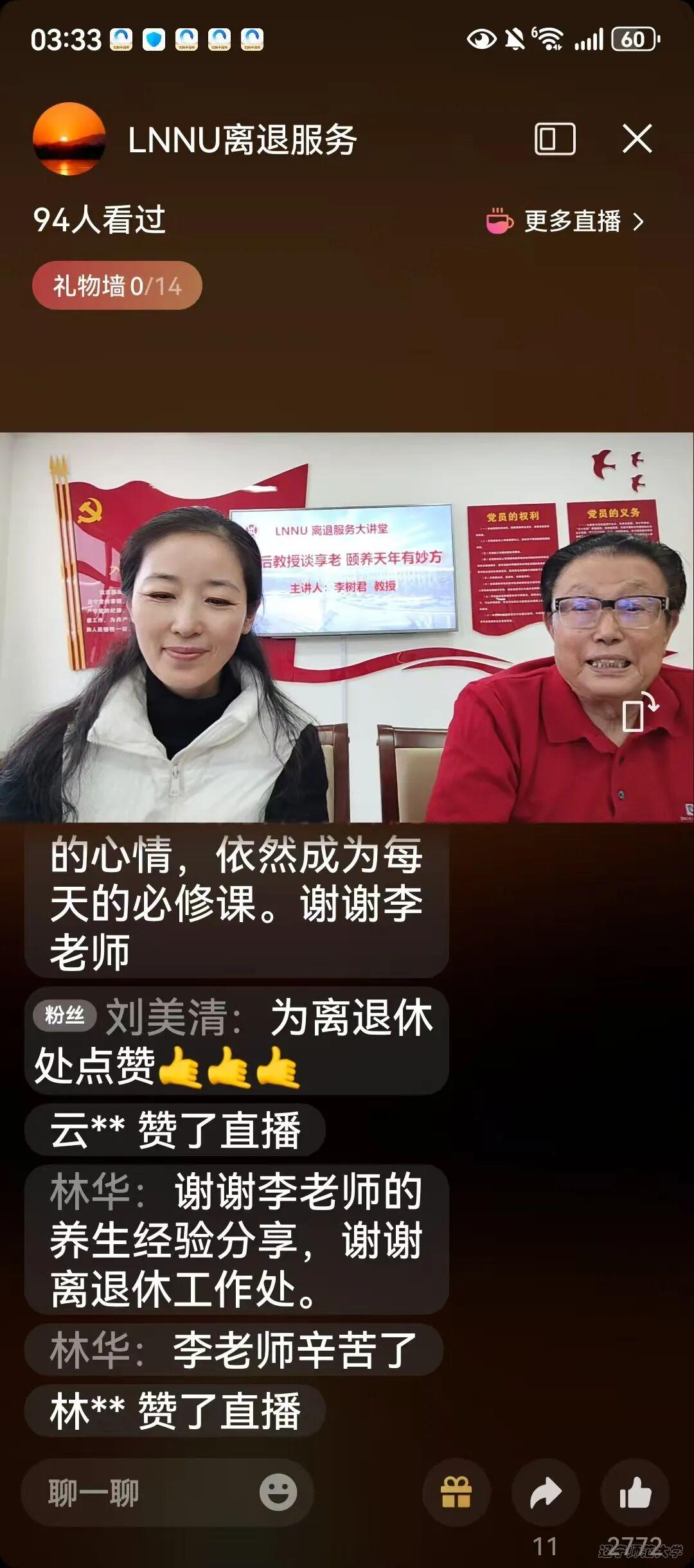 直播中,李教授还通过评论区互动,实时解答老同志提出的“如何保养头发”、“如何保持良好的精神面貌”等问题,互动氛围热烈。参与讲座的老同志纷纷在后台留言点赞,感谢李老师对养生经验的分享,为离退休工作处点赞。下一步,离退休工作处将继续依托新媒体平台,推出更多针对性强、形式多样的线上服务活动,持续为老同志的身心健康保驾护航。