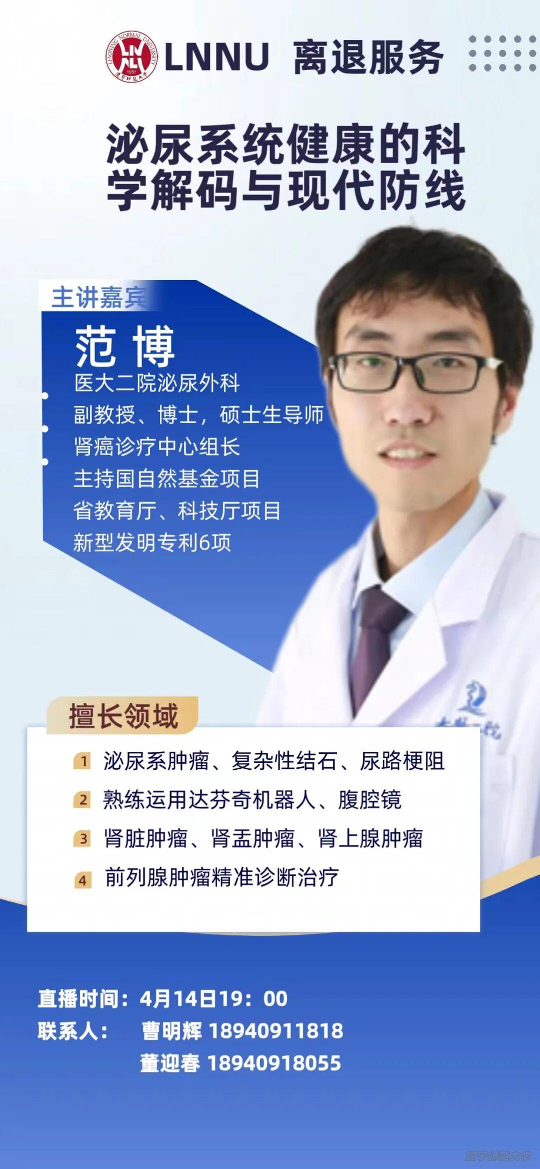 为切实关爱离退休老同志身心健康,普及专业的泌尿系统疾病防治知识,提升老年群体自我健康管理能力,4月13日晚7点,离退休工作处精心筹备,特邀大连医科大学附属第二医院泌尿外科范博副教授,做客“LNNU离退服务”直播间,带来题为《泌尿系统健康的科学解码与现代防线》的专题健康讲座。80余位离退休老同志齐聚云端参与学习,90分钟的专业科普干货满满,获得老同志们一致好评与纷纷致谢。